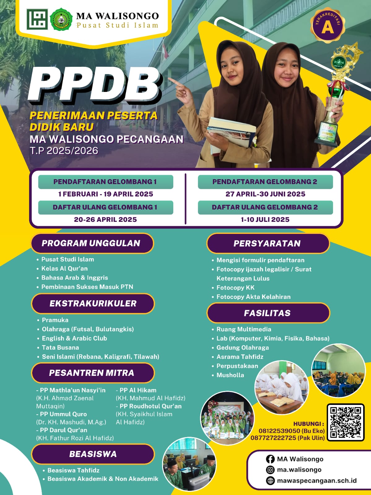 Pecangaan, Jepara - Madrasah Aliyah (MA) Walisongo Pecangaan secara resmi membuka penerimaan siswa baru untuk tahun ajaran 2025/2026. Proses penerimaan dimulai pada tanggal 1 Februari 2025 hingga tanggal 30 Juni 2025.